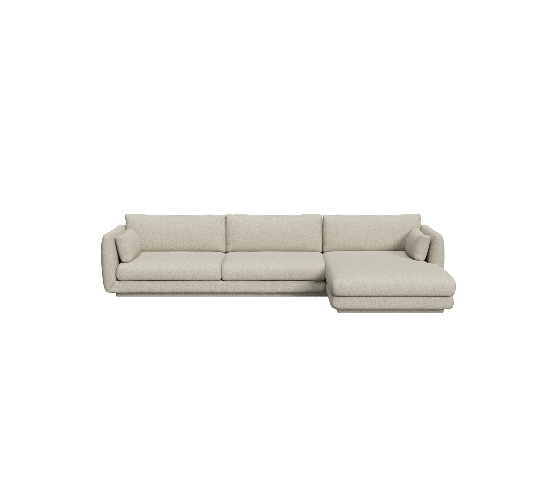 The Bloom 3-seater sofa with left-hand chaise longue by Cane-line Design exudes luxurious comfort and elegance. The low plinth base grounds the design with sculptural simplicity, while the chaise longue offers additional space to unwind. The deep, upholstered seating and high-performance cushions provide excellent support, balancing form and function in a sophisticated piece. Prefer a natural finish? Explore the same 3-seater chaise longue sofa with teak legs. The sofa is also available in right-hand versions with plinth or teak legs.