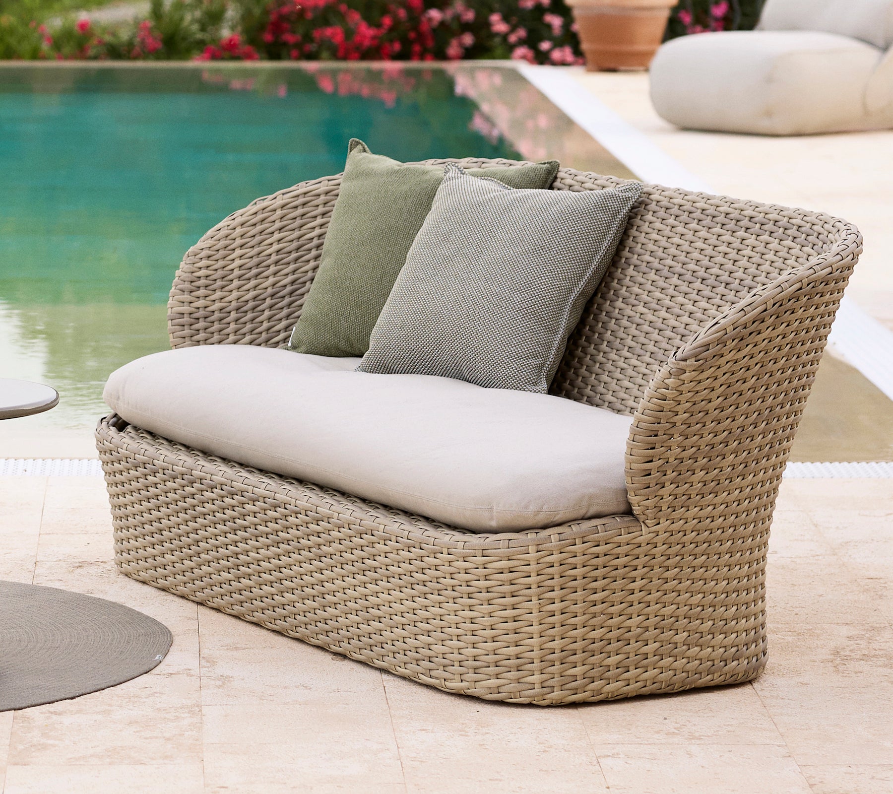 Modern grey sofa with cushions and round table by a poolside.