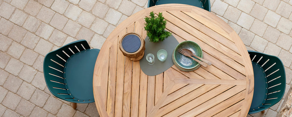Define is an elegant round table designed by Cane-line Design for outdoor dining al fresco. It is made from certified Grade A teak, drawing inspiration from the iconic teak pattern. With its perfect fusion of aesthetics and durability, the Define round dining table brings warmth and charm to any outdoor space, creating an inviting setting for dining al fresco. As time passes the wood develops a charming silver-grey patina, giving it a natural appeal. To retain the warm golden-brown hue and preserve the exquisite teak wood, we recommend using Cane-line Teak Care products.