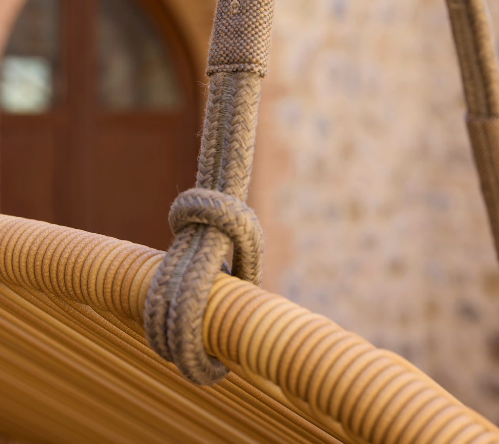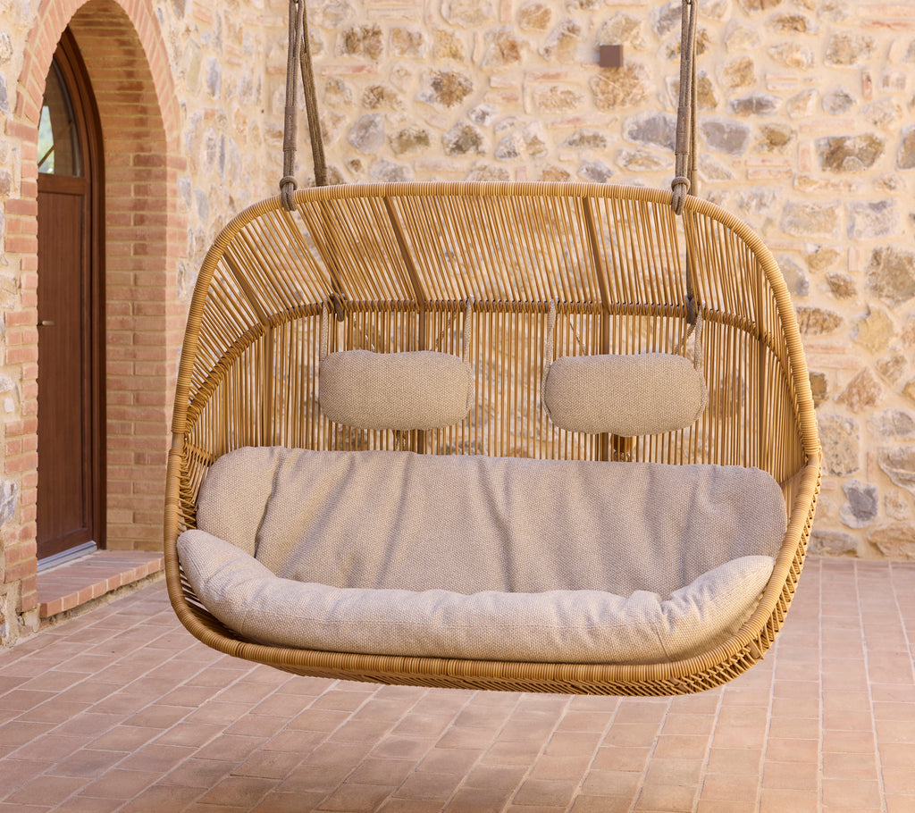 The Hive 2-seater sofa exudes a sculptural elegance that makes it an eye-catching centerpiece in any outdoor space, whether as a standalone piece or part of a larger setup. The sofa, designed by Foersom & Hiort-Lorenzen MDD, takes inspiration from the natural shape of a beehive. Its organic form invites you to unwind and enjoy moments of reflection and relaxation in a unique, embracing design. The Hive sofa is handwoven in the weather-resistant Cane-line Weave® in a delicate and artistic wicker pattern, which brings both style and durability to your outdoor space. It can be placed hanging in a rope for a playful, floating effect or placed on a solid base in premium teak, allowing for versatile placement. The generous cushions, featuring the QuickDry & Airflow system, ensure rapid drying after a downpour, providing long-lasting comfort in any weather.