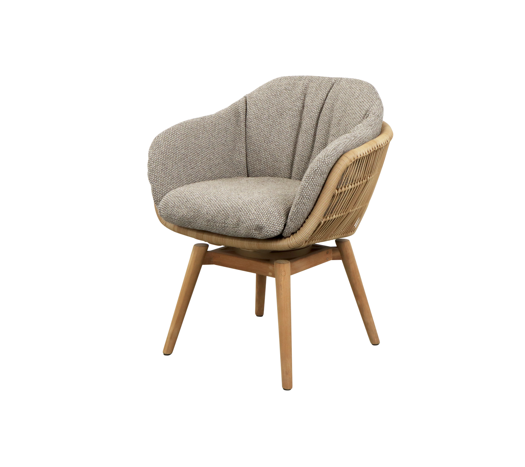 The Stay outdoor dining chair designed by Cane-line Design features a generously curved, nest-like shape that offers a cosy inviting embrace, perfect for relaxation. Its handwoven shell, made from durable Cane-line Weave®, showcases an open wicker pattern, creating a light and airy feel while ensuring UV resistance for long-lasting durability. Resting on a solid teak base with a smooth swivel function, the chair allows effortless movement without compromising stability. The plush cushions, designed with QuickDry & Airflow system, provide exceptional comfort and dry quickly after rain. Combining natural elegance with modern functionality, this chair is ideal for those seeking both style and practicality in their outdoor space.