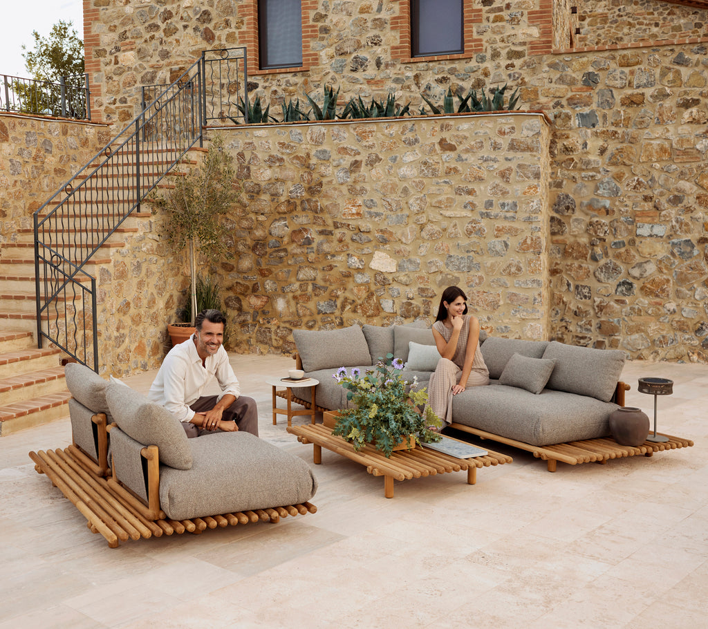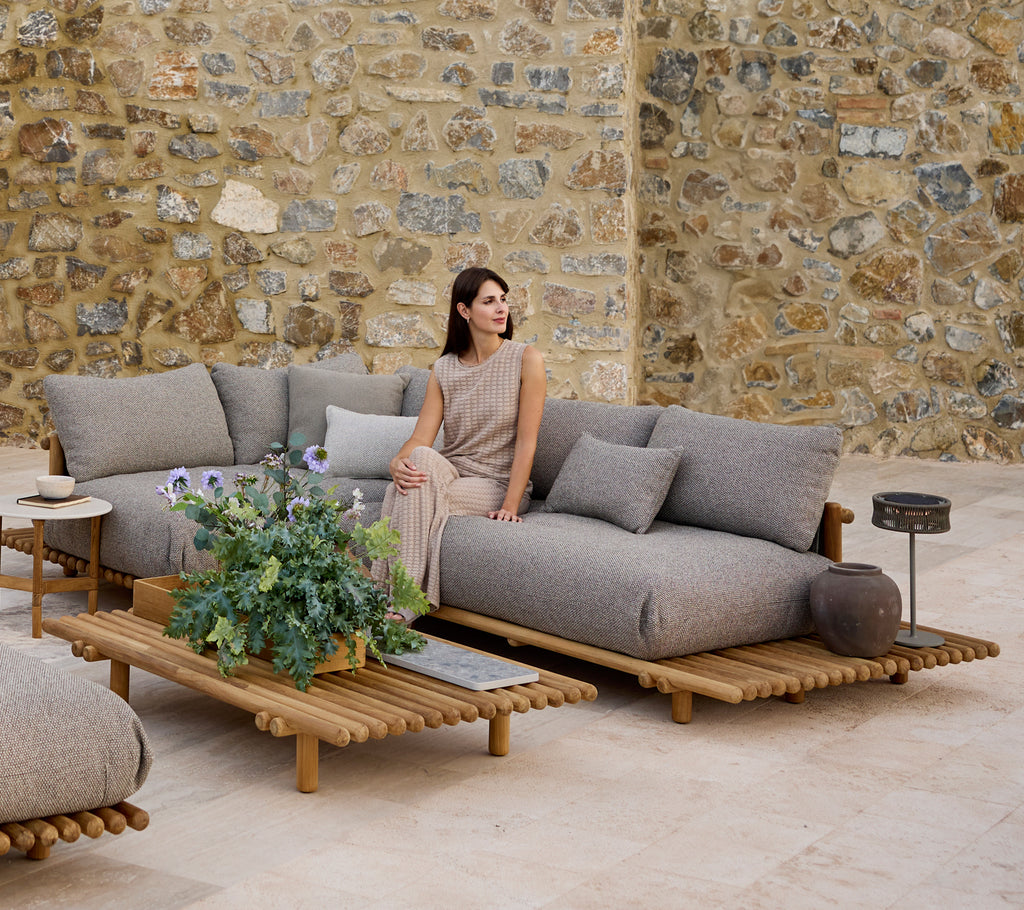 The Sticks Platform corner sofa, designed by Cane-line Design, blends casual comfort and sophisticated design, making it perfect for solo lounging or social gatherings. Its durable frame comes in certified teak, which gains a beautiful silver-grey patina over time. If you wish to preserve the original golden-brown colour, we recommend using our Teak Care products. The frame is also available in powder-coated aluminium with strong durability and low maintenance. The plush seating and back cushions are made with resilient fabric and feature the innovative QuickDry & Airflow system, providing quick-drying and optimal air circulation all year round, even after rain.
